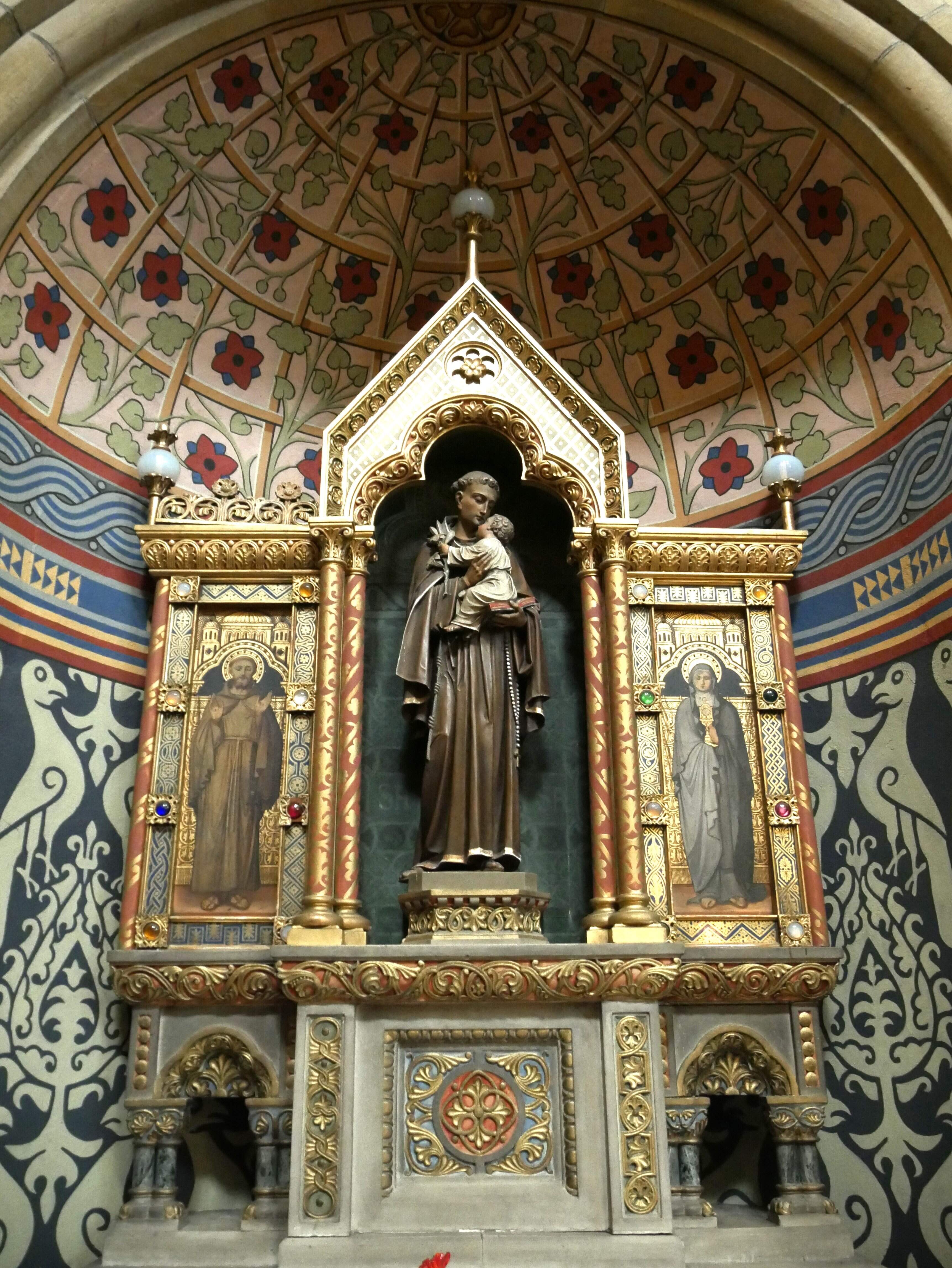 • Cliquez pour agrandir l'image 102-L-autel de Saint-Antoine de Padoue, le troisième saint patron de l’église-Entouré de  St François d’Assise et à droite, Ste Claire,.JPG