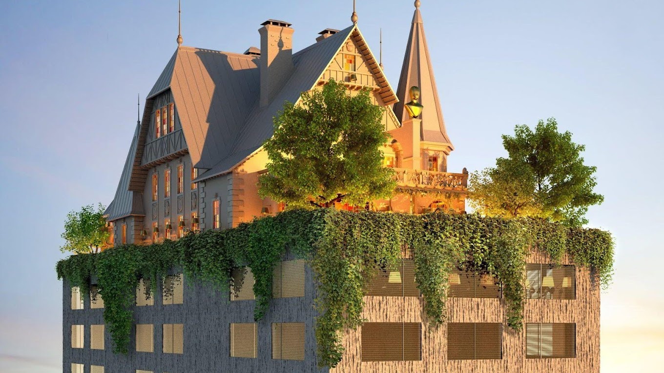 • Cliquez pour agrandir l'image 100- L-Hôtel Hilton- Un bloc sur lequel surgit une maison.JPG